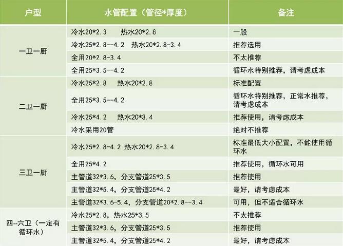 3.在預(yù)算成本寬松的情況下,可以選擇最高配置,在預(yù)算成本緊張的情況下,首先考慮管的大小,在考慮管壁厚度。因?yàn)楣軓酱笮Q定水壓大小,管壁厚度決定耐用性和突發(fā)事件。比如,我們的冷水管只要用到20*2.3,25*2.8,32*3.6,熱水管只要用20*2.8,25*3.5,32*5.4,就已經(jīng)完全滿足家裝水壓要求。但是,厚的水管也是有很多好處的,一個(gè)是耐用性時(shí)間要長(zhǎng)一些,一個(gè)是在突發(fā)情況下,比如低溫,比如長(zhǎng)期高溫(熱水器出口)就有優(yōu)勢(shì)。一定是先選擇大小,在選擇厚度。同時(shí),我們?cè)诳囱b飾公司預(yù)算時(shí),很多時(shí)候大小厚度產(chǎn)生的成本遠(yuǎn)遠(yuǎn)超過(guò)了品牌之間的價(jià)格差距。很多低端公司采用報(bào)高端名牌的牌子,采用很小管徑的水管和管件,甚至偷工減料,布管不完全,甚至假貨,他的成本還沒(méi)有普通水管正常配置的成本高。